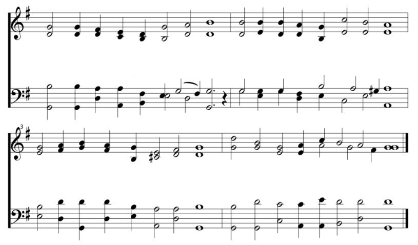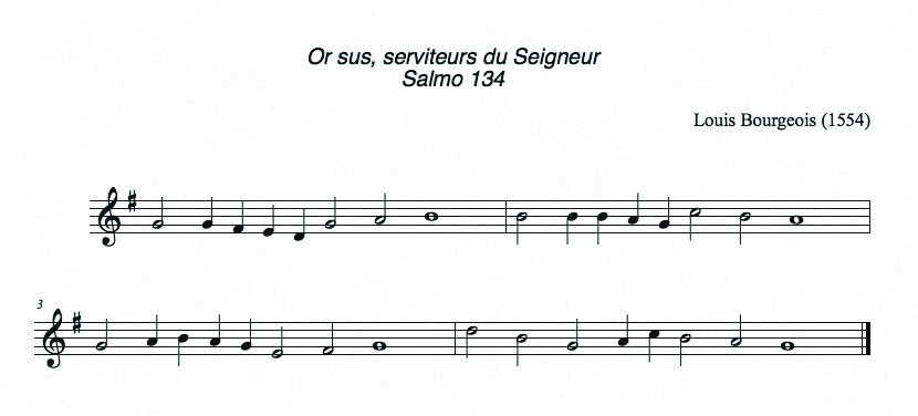 Utilizaremos, a seguir, alguns exemplos para ilustrar. Uma única e antiga melodia será usada para tal fim, “Our Sus Serviteurs Du Seigneur”, música do século 16 composta por Louis de Borgeois e utilizada como cântico cristão com a letra inspirado no Salmo 134 e inserida no livro de música chamado Saltério de Genebra. Mostraremos alguns tipos de harmonização do tradicional ao moderno gospel. No início, a música ocidental utiliza melodia única, cantada em uníssono ou em oitavas. A harmonização é um processo gradativo e mutável, e autores e arranjadores posteriores poderiam modificá-la. A seguir, temos a melodia selecionada como exemplo.