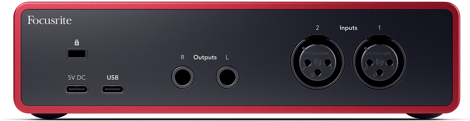 A quarta geração Scarlett inclui três produtos: Solo, 2i2 e 4i4, todos alimentados através de soquetes USB Tipo C. Neste artigo, nos debruçaremos sobre o modelo 2i2, que possui uma segunda porta USB C na parte traseira, caso seja necessária uma fonte de alimentação adicional. Em contraste com a terceira geração 2i2, que tinha soquetes de entrada combo para acomodar cabos XLR e 1/4”, a nova 2i2 oferece duas entradas de 1/4” no painel frontal, assim como a saída
