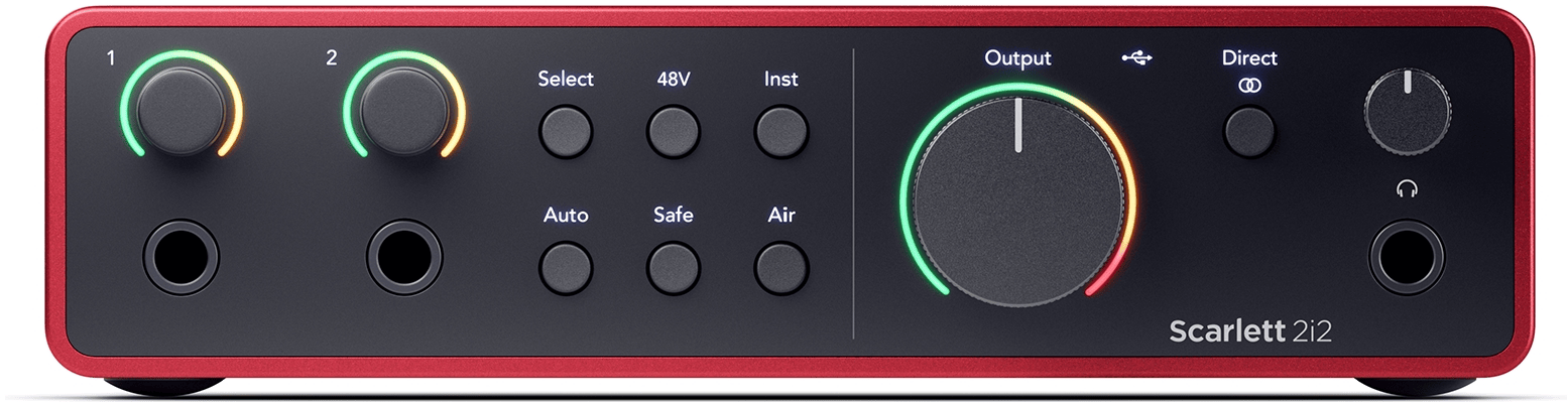 Em relação ao layout do painel frontal, o que chama a atenção é que não existem mais botões individuais para phantom power, tipo de entrada e Air para cada uma. Em vez disso, há apenas um de cada para atender ambas as entradas de microfone/linha, e eles são conectados por três novos botões denominados Select, Auto e Safe. E esse é o maior aprimoramento da quarta geração das Scarlett: o modelo 2i2 possue pré-amplificadores controlados digitalmente, ao passo que os anteriores ofereciam pré-amplificadores de microfone convencionais controlados por potenciômetros de ganho. O controle de ganho acima de cada soquete de entrada é agora um codificador rotativo de ganho infinito e, em vez de estarem vinculado a entradas fixas, o Air e outros botões de controle operam em qualquer entrada selecionada pelo botão Select. Pressionar esse botão por alguns segundos vincula as duas entradas de microfone/ linha para que possam ser ajustadas conjuntamente, recurso muito útil quando se está gravando uma fonte estéreo.